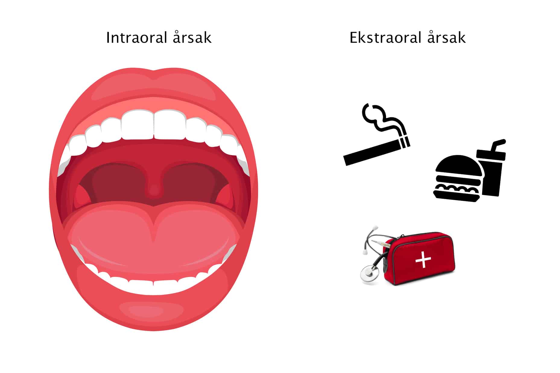 Dette kan i hovedsak deles inn i to kategorier: ekstraorale (utenfor munnhulen) og intraorale årsaker (innad i munnhulen).
